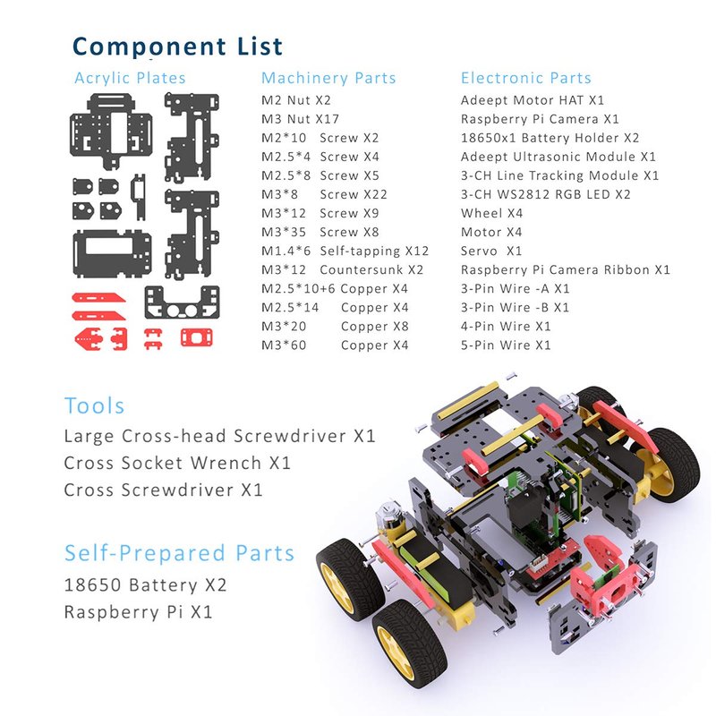 - AWR(Adeept Wheeled Robot) - This is a RPi-based robot mobile platform(Compatible with RPi 4/3B/3B+, RPi board is NOT included). It is equipped with four geared motors, so it has strong power.