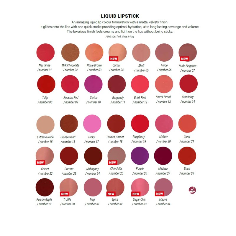 An amazing liquid lip color formulation with a matte, velvety finish. It glides onto the lips with one quick stroke providing optimal hydration, ultra long-lasting coverage and volume. The luxurious finish feels creamy and light on the lips without being sticky. The texture ensures a smooth and even application, while creating a pampering cover on the lips, it leaves an intense, vibrating and long lasting color guaranteeing at the meantime an impalpable and weightless feeling. It glides easily on lips leaving a rich and matte finish, the color multifaceted and the lasting incredible. The color payoff is rich, highly pigmented and absolutely gorgeous. Moreover, it doesn’t fade. An incredible liquid lipstick easy and practical to use thanks its special soft and spongy cushion applicator and In a classic wood-clenched form, slims are ideal for fine contours on lips. A lipliner gives lips the perfect shape, by contouring the outer or inner border of the lip, maximizing or minimizing the lips as desired. Hypoallergenic and waterproof.Dermatologically tested.
