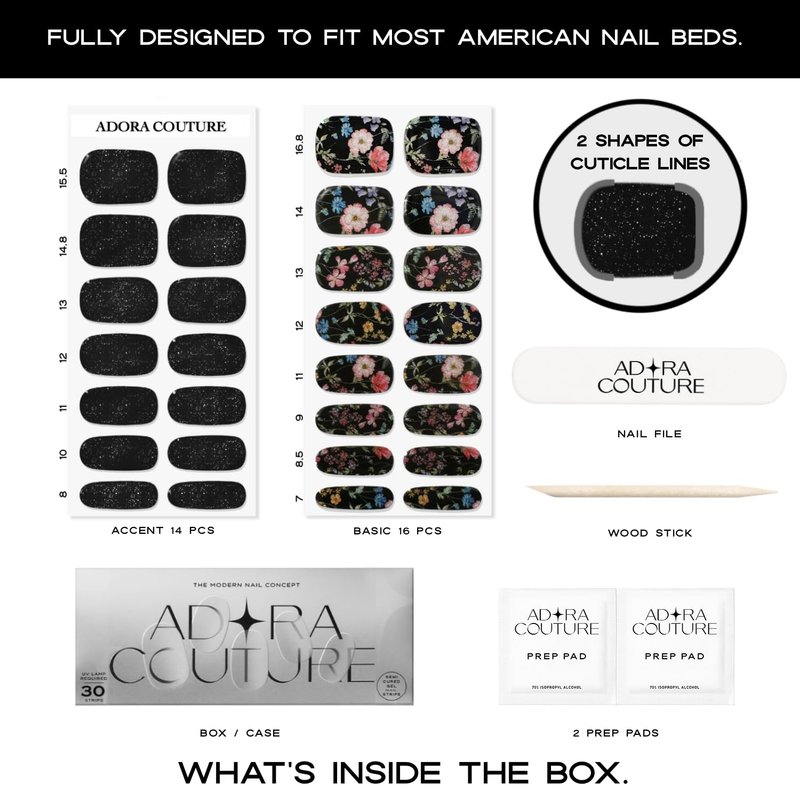 ADORA COUTURE Semi Cured Gel Nail Strips Kit | 30pcs Uv Gel Nail Stickers with Uv Light | Glitter Velvet Colorful Flowers Black Nail Wraps | Gel Stickers for Nails Uv Light (Night Garden)