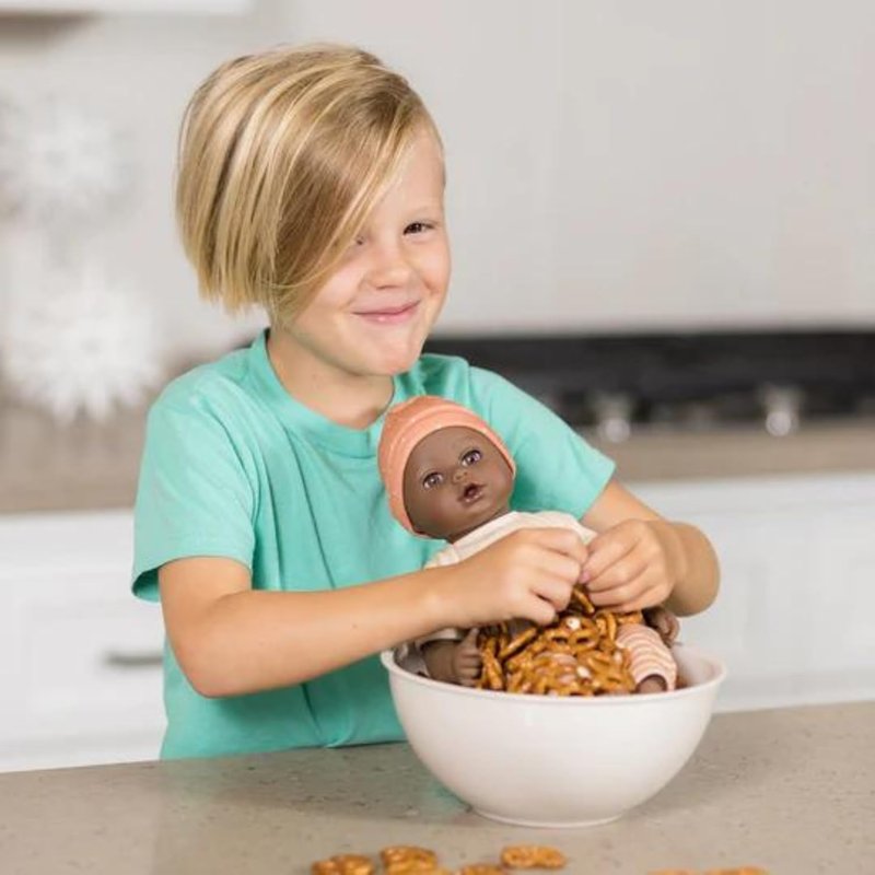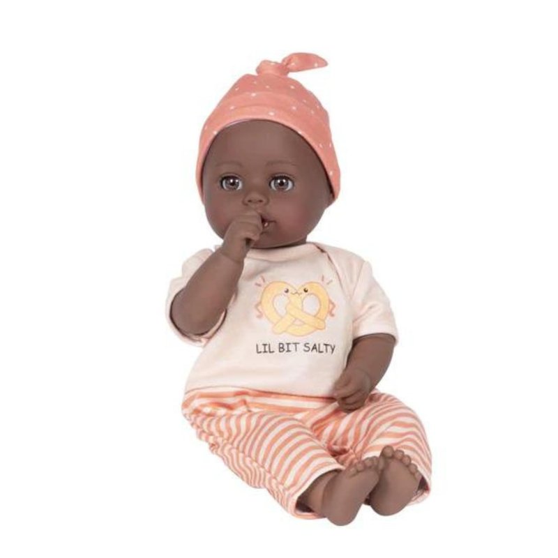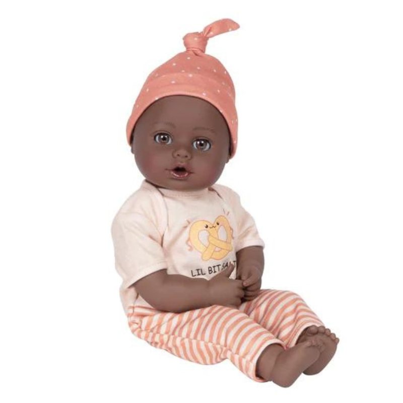 - 5-PIECE DOLL SET - This Adora Sweet Pretzel baby doll set includes one 13-inch African American doll, pretzel-printed shirt, pants, matching beanie, blue baby bottle.