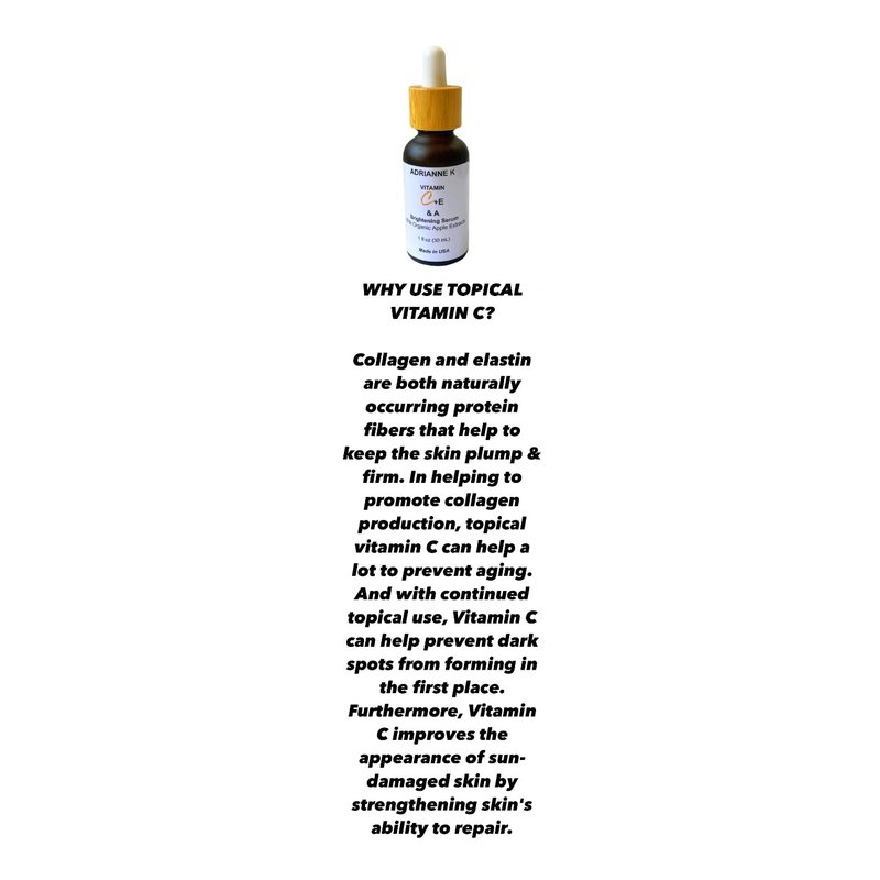 ADRIANNE K Brightening Serum,1 fl oz, powerful brightening agents reduce the appearance of discoloration, hyperpigmentation, and sunspots. This illuminating treatment serum is enriched with vitamin E A and CO chamomile and CO apple extracts. A lightweight serum, which brightens, fights signs of aging, and protects skin from environmental aggressors to keep skin looking radiant and healthy. Free of parabens, phthalates, artificial fragrance and other harmful unnecessary chemicals. Contains certified organic apple extracts+chamomile. Formulated vegan and cruelty-free. Proudly made in the USA by Medical Esthetician, Adrianne Kahen. DIRECTIONS: Apply a thin layer to clean and dry skin every day or every other day (if you are alternating with ADRIANNE K Hyaluronic Acid Serum).