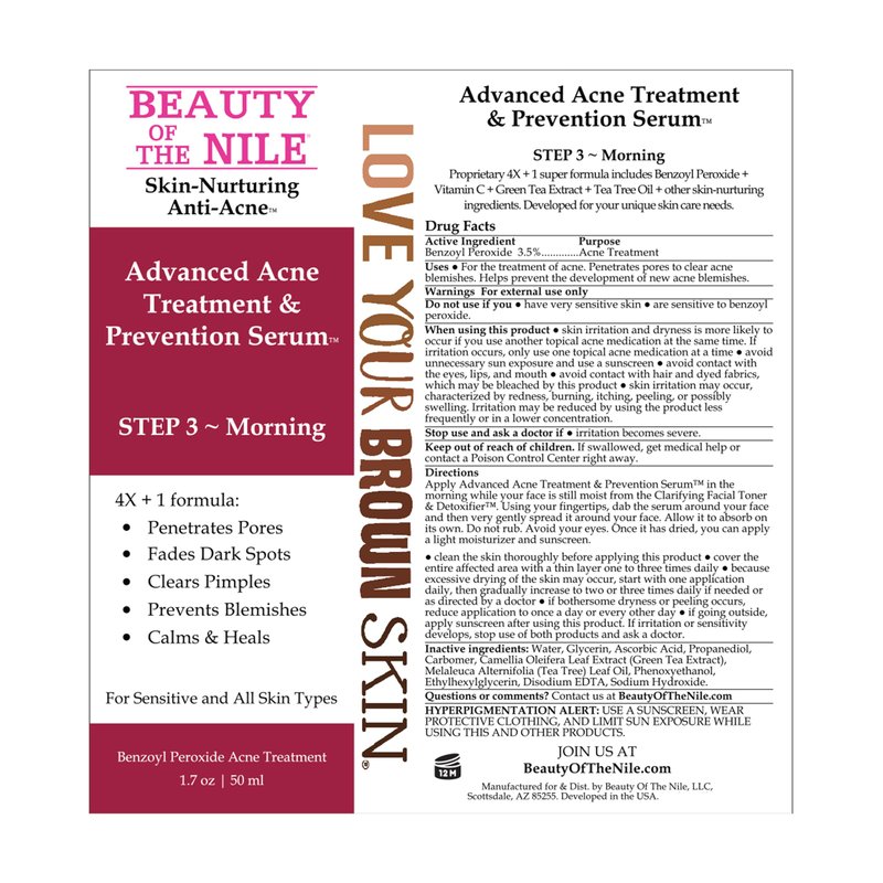 Advanced Acne Treatment & Prevention Serum for Skin-of-Color - Fights Acne, Reduces Discoloration, Handles Dark Sports, Clears Pores, Helps Blemishes & Whiteheads, Targets Acne Impurities, Calms Irritation, Clears Pimples, Heals - Benzoyl Peroxide, Vitamin C, Green Tea Extract, Tea Tree Oil, for Sensitive Skin, Adults & Teens, 1.7 fl. Oz, Beauty Of The Nile