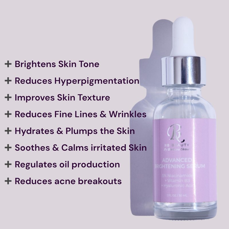 - PREMIUM BENEFITS OF ADVANCED BRIGHTENING SERUM - Brightens skin tone and reduces hyperpigmentation - Minimizes the appearance of enlarged pores & Improves skin texture - Reduces the appearance of fine lines and wrinkles - Hydrates and plumps the skin - Soothes and calms irritated skin - Regulates oil production and reduces acne breakouts - Protects the skin from environmental damage