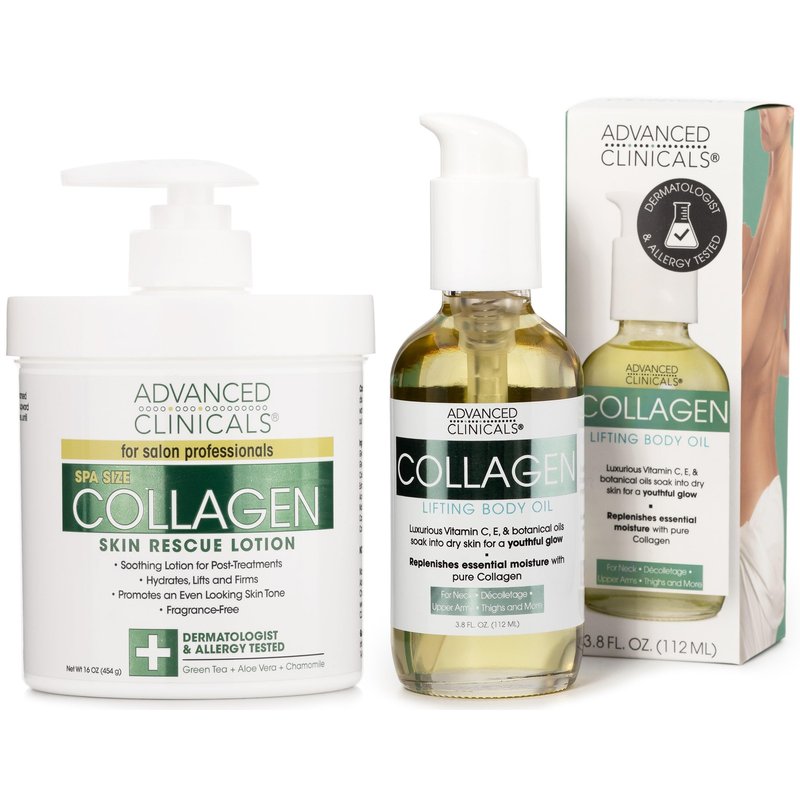 Advanced Clinicals Collagen Body Oil + Collagen Cream Body Lotion & Face Cream Beauty Skin Care 2PC Bundle – Tighten, Firm, & Hydrate Moisturizer Set For Scars, Wrinkles, Crepey Skin, & Stretch Marks