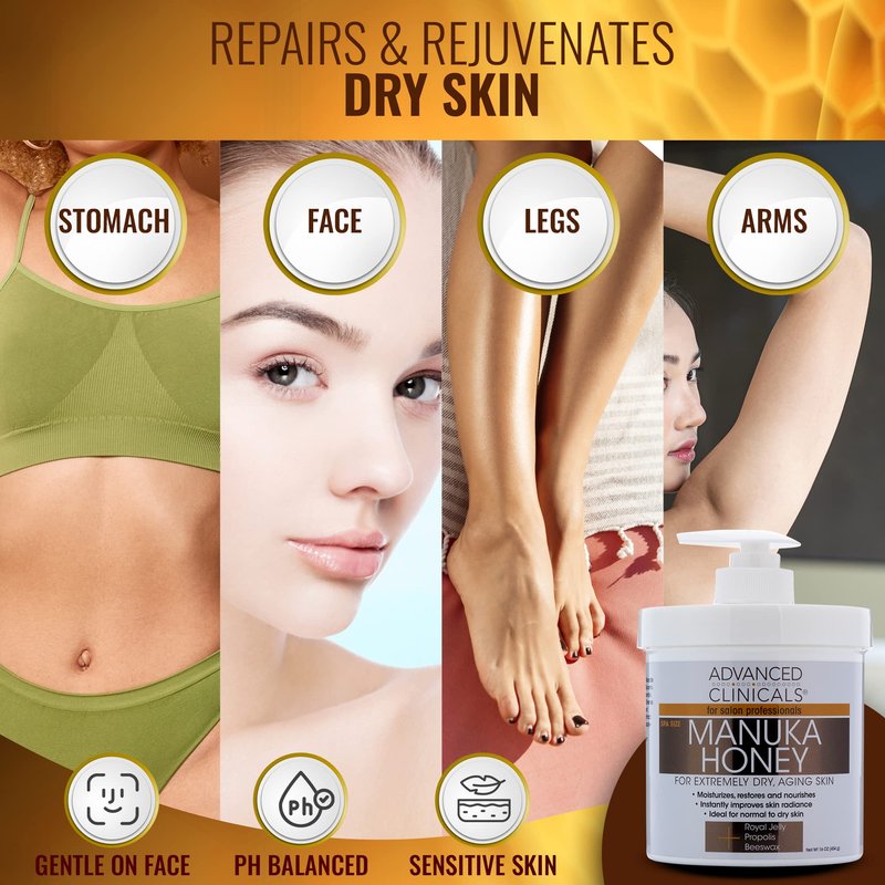 - RADIANT SKIN – Advanced Clinicals Manuka Honey Cream 3-in-1 formula moisturizes, restores, & nourishes aging skin to help combat the pesky appearance of discolored skin, age spots, freckles, wrinkles, fine lines, damage from sun spots, hyperpigmentation, & acne scars. Manuka Honey is rich in amino acids which exfoliates away dead skin cells, helping to keep your pores open and clear. The perfect lotion for extremely dry skin to help your skin maintain a natural, youthful glow.