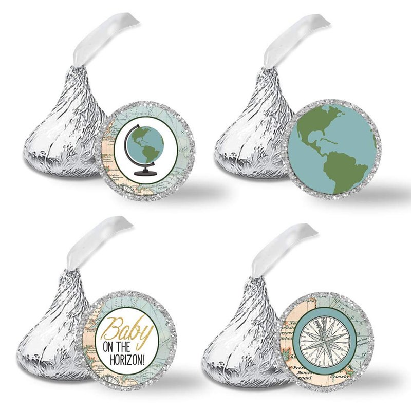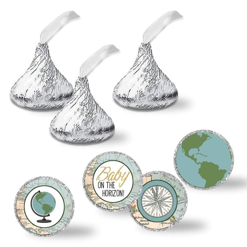 - Cuteness Overload: Designed by a talented mom, these colorful stickers feature a beautiful map background design with a fun globe and gold accents (gold is digital and not actual gold foil). This theme is perfect for baby girls or baby boys. The mom to be will love the elegance. They are designed to fit on the bottom of your favorite chocolate kisses. Amanda Creation. Original design by Amanda Creation