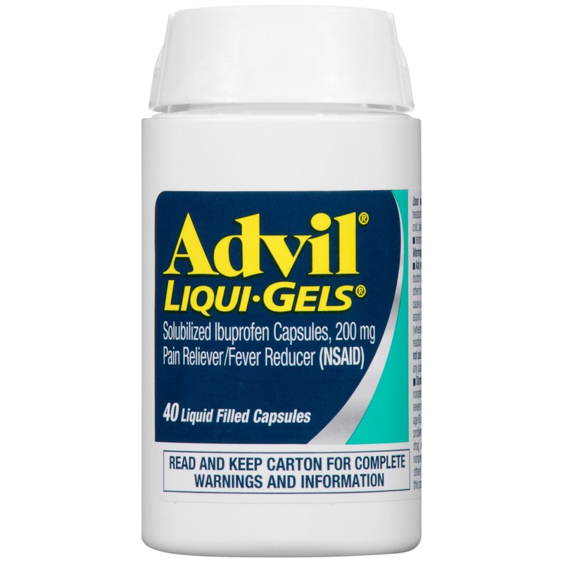 - One package of 40 Advil Liqui-Gels Pain Reliever and Fever Reducer Liquid Filled Capsules, Pain Medicine for Adults with Ibuprofen 200mg for Headache, Backache, Menstrual Pain and Joint Pain Relief
