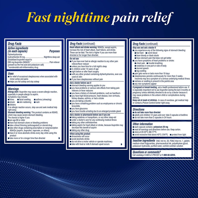 - One bottle of 80 liquid filled capsules of Advil PM Liqui-Gels Pain Reliever and Nighttime Sleep Aid, Pain Medicine with Ibuprofen for Pain Relief and Diphenhydramine HCL for a Sleep Aid