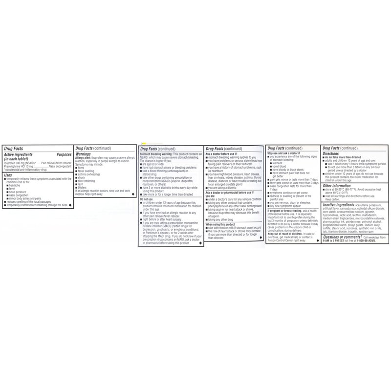 - One package of 10 coated tablets of Advil Sinus Congestion and Pain, Sinus Relief Medicine, Pain Reliever and Fever Reducer with Ibuprofen and Phenylephrine HCl