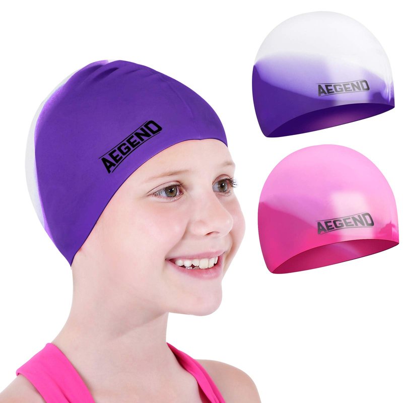 - 2 Pack- Aegend’s latest 2 pack swimming caps. The design of mixed colors makes the kids more eye-catching in the crowd, thus providing extra protection for them. Two sizes are suitable for children at 2-12 years old. Tips: Please choose a bigger size, if your kid has a big head or thick hair.