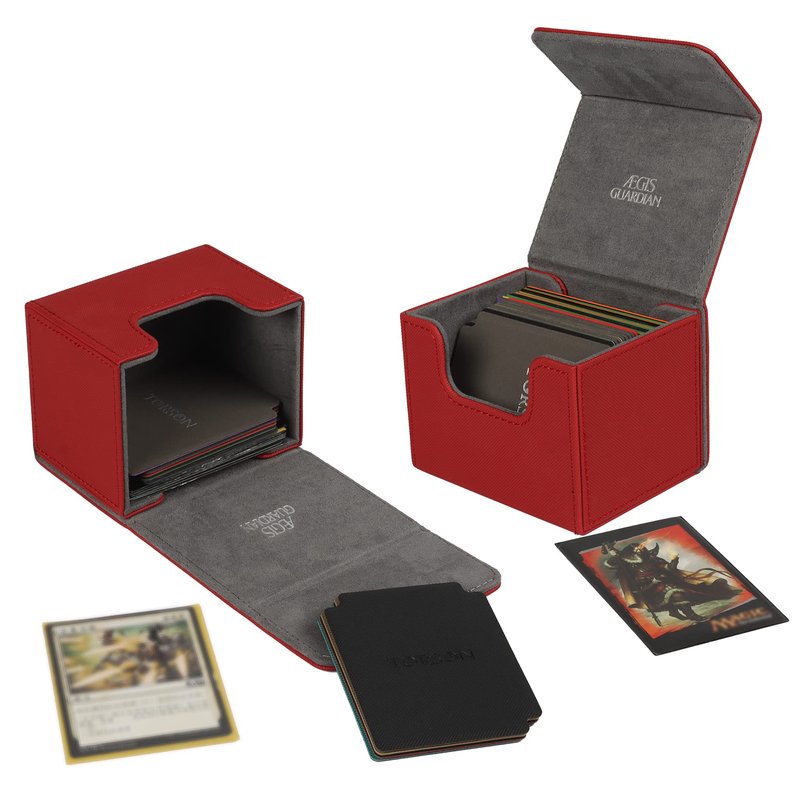 AEGIS GUARDIAN Card Deck Box for MTG, Commander Deck Box Hold 120+ Sleeved Cards, Leather Strong Magnet Card Deck Case Holder for Magic Cards TCG CCG, Red and Greay Ineer