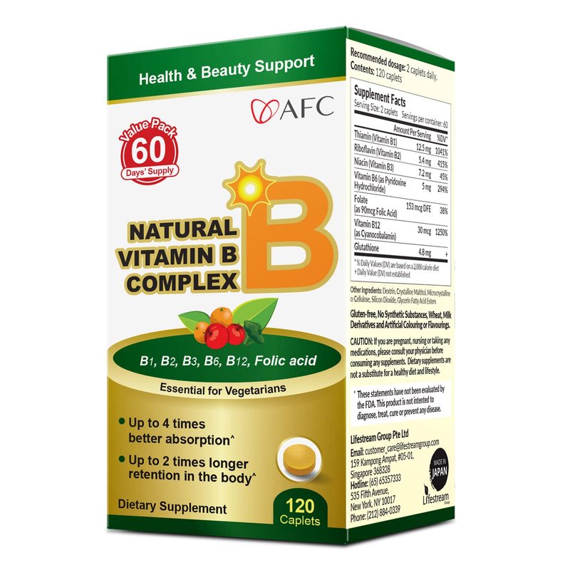 AFC Japan Natural Vitamin B Complex with B1, B2, B3, B6, B12, Folic Acid & Glutathione Yeast Extract, No Synthetics, Non-GMO, Supplement for Stress, Energy, Immune & Nervous System,120 Vegan Caplets