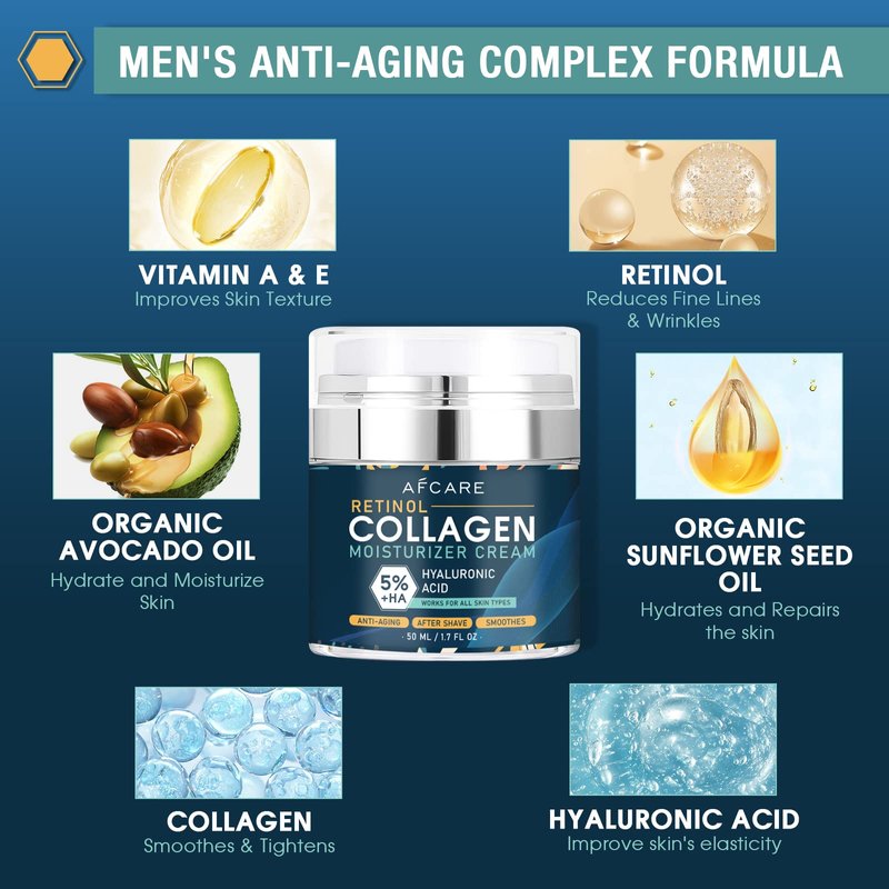 - Infused with collagen and hyaluronic acid, this moisturizer face cream men helps to reduce fine lines and wrinkles, while improving skin elasticity for a more youthful appearance.