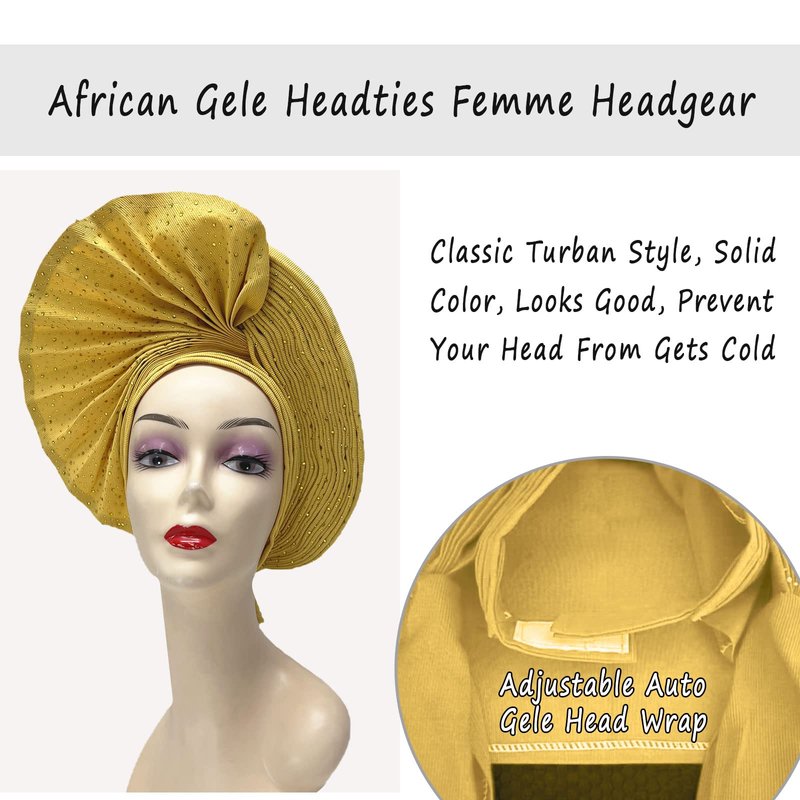 African Head Wrap Already Made Auto Gele Headties Women's Turban Hats&Caps Beading Wedding Nigerian Fashion Headbands (Gold)
