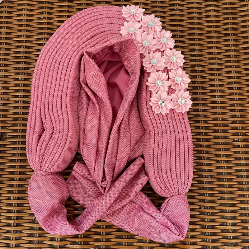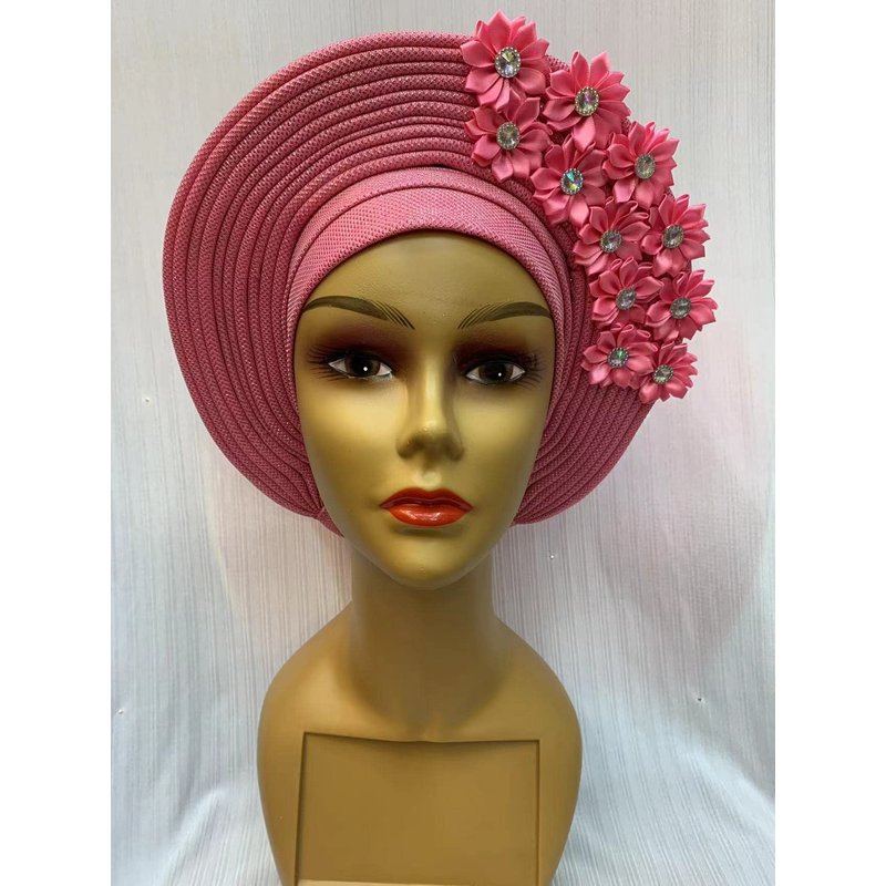 African Headtie Turban Nigerian Aso Oke Muslim Headwear Gele Head Wrap Sego Auto Gele Headties Already Made Women's Headband For Party (Pink)
