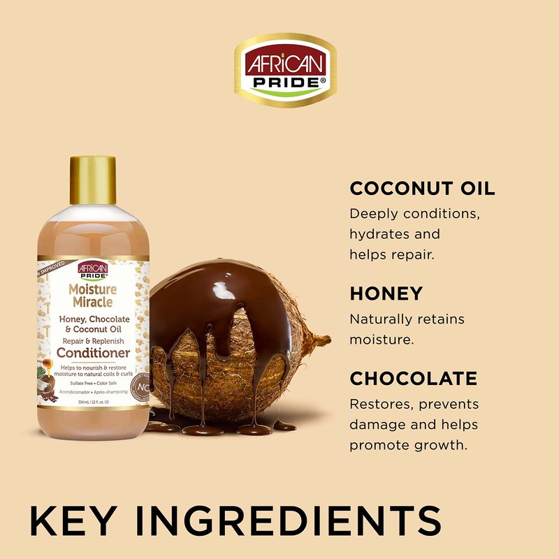- PROVEN HAIR CARE - The moisturizing blend of African Pride Moisture Miracle Honey, Chocolate & Coconut Oil Conditioner uses the natural benefits of Honey & Coconut Oil plus the restorative benefits of Chocolate to hydrate & nourish dry coils & curls.