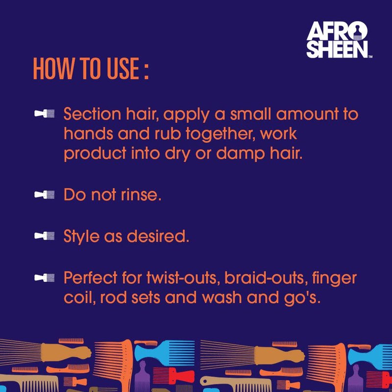 - ABOUT THE BRAND - Afro Sheen is the brand for the innovators, the change makers, the culture creators of today. Providing the sheen you want for whatever style you choose. Premium oils, silky cream gels and nourishing butters deliver quality ingredients for all textured hair.