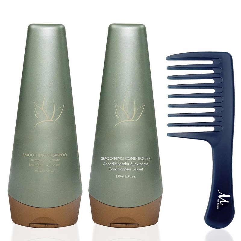 Transform hair with the Agave Smoothing Shampoo and Conditioner Duo. This 8.5-ounce set nourishes and smooths hair, reducing frizz and enhancing shine. The bundle includes an M Hair Designs detangling comb for easy, tangle-free styling.