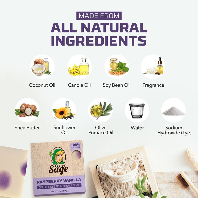 - WOMEN'S SOAP BAR RASPBERRY VANILLA SCENT: Rejuvenate your mind, body, and soul as Age of Sage lets you feel an excellent bathing shower experience with its Handmade Raspberry Vanilla Scent women's bar soap. Each body bar soap is made with a distinctive natural soap for women or a Raspberry Vanilla-inspired fragrance that cleanses your skin while keeping it moisturized and nourished.