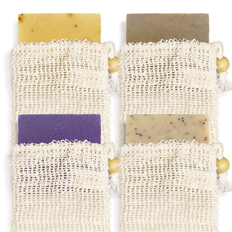 - COMES IN A SOAP BAG: Our shower products each come in a sisal pouch that serves as a body scrubber. Made with natural fiber, the sisal soap pouch lets you slide the soap with an excellent grip as it gently exfoliates your skin. The pouch also serves as a soap saver bag as it enhances the foam lather of soap and helps dry the body bar soap between uses.