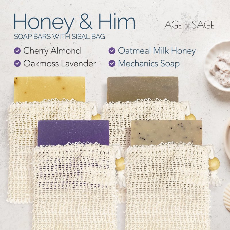 Age of Sage Natural Soap Bar w/Sisal Bag, 4pk Vegan Artisan Soap Set for Women - Honey & Him Scent: Cherry Almond, Oatmeal Milk Honey, Oakmoss Lavender, & Mechanics Soap