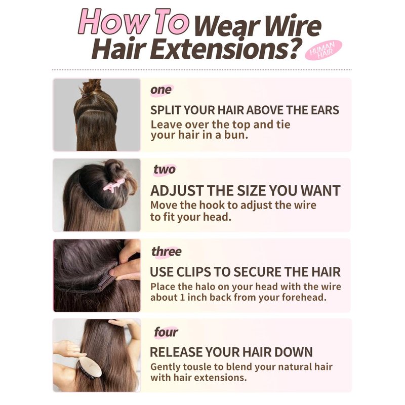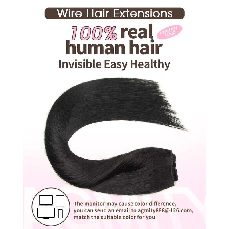 - 【Quick & Long Lasting Wear Wire Hair Extensions】 Wire hair extensions real human hair are super easy to apply and remove, you can add volume and length to your hair in just 1 minute. It can blend perfectly with your hair with the adjustable invisible transparent wire and the clips on the lace weft. Hair doesn't move when you shake your head, which means you're wearing it correctly.