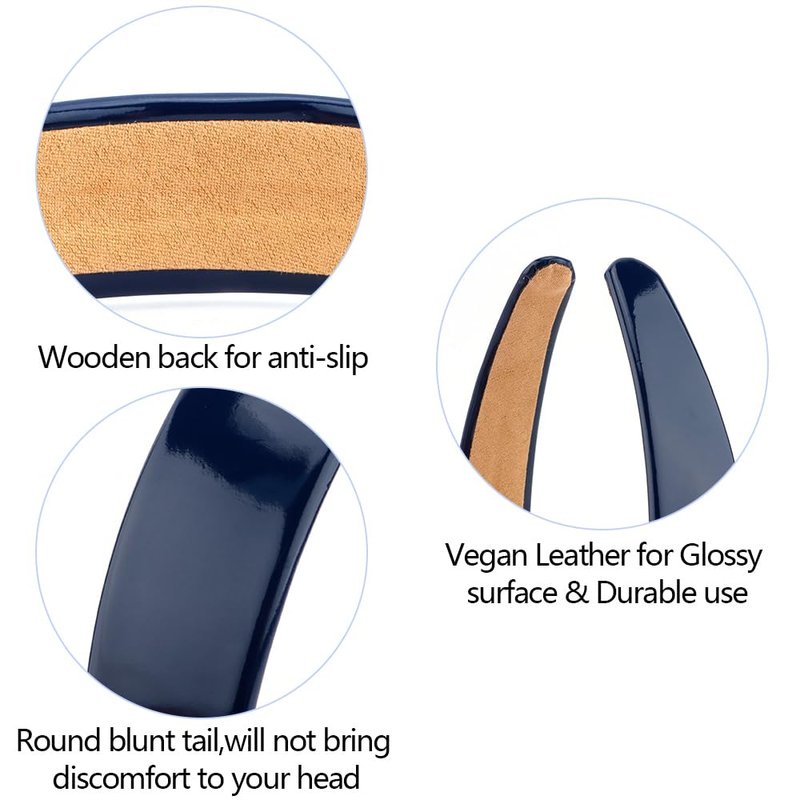 - 【GLOSSY VEGAN LEATHER】 The soild color headband is made of high quality vegan leather with a soft non-slip inner lining. Unlike other plastic materials, the smooth leather material makes the color more bright and textured. We offer many classic colors to choose from, to match you different outfits. Classic and retro style, the headpiece suitable for dressing up or daily hair care.