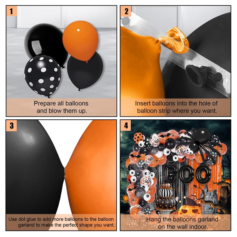 - Halloween Balloons Multi-functional Application: Halloween balloon sets are essential Halloween decorations,not only for indoor Halloween decorations, such as Windows, doors, walls, porches,stairs,school and bar decorations,but also for outdoor Halloween decorations,such as yards, gardens, parties, anniversaries, barbecues, etc. Use the unique Halloween balloon wreath arch to decorate the front of your house and it will attract a lot of neighbors and kids to visit and go trick-or-treating.