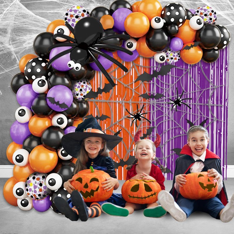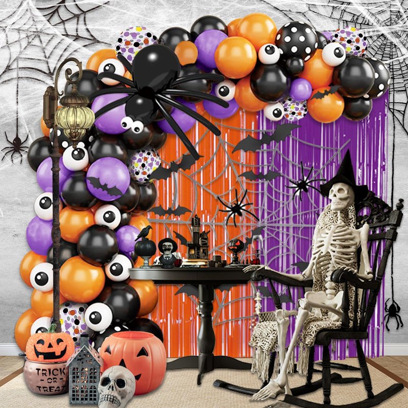 - Halloween party decorations: including 2 18In black balloons, 20 10In black balloons, 10 5In black balloons,25 10In orange balloons,10 5In orange balloons,15 10In purple balloons,15 5In purple balloons,5 12In black and white dot balloons,5 12In white with colorful dot balloons, 20 5In white eye balloons,12 bats,8 black strips balloons,1 spider web,1PCS 3.2x6.5ft Purple Foil Fringe Curtain, 1PCS 3.2x6.5ft Orange Foil Fringe Curtain,1 16ft strip,1 dot glue, and 1 tool