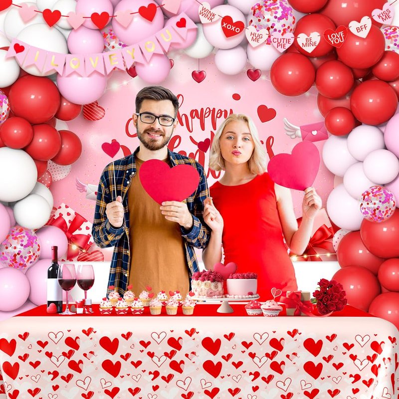- Valentines Day Package: 170pcs red pink white and colorful confetti valentine's day balloons, 1pcs happy valentine's day backdrop and 1pcs pink and red heart tablecloth, 1pcs xoxo hug me wink cutie pie banner, 1pcs long sweetheart banner, and 1pcs I love you banner