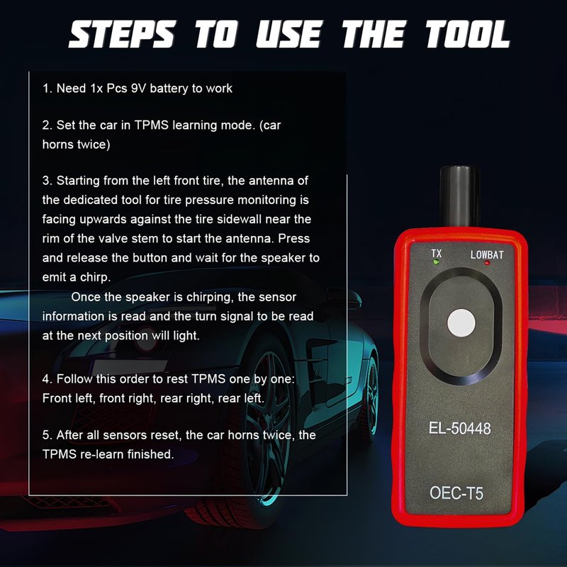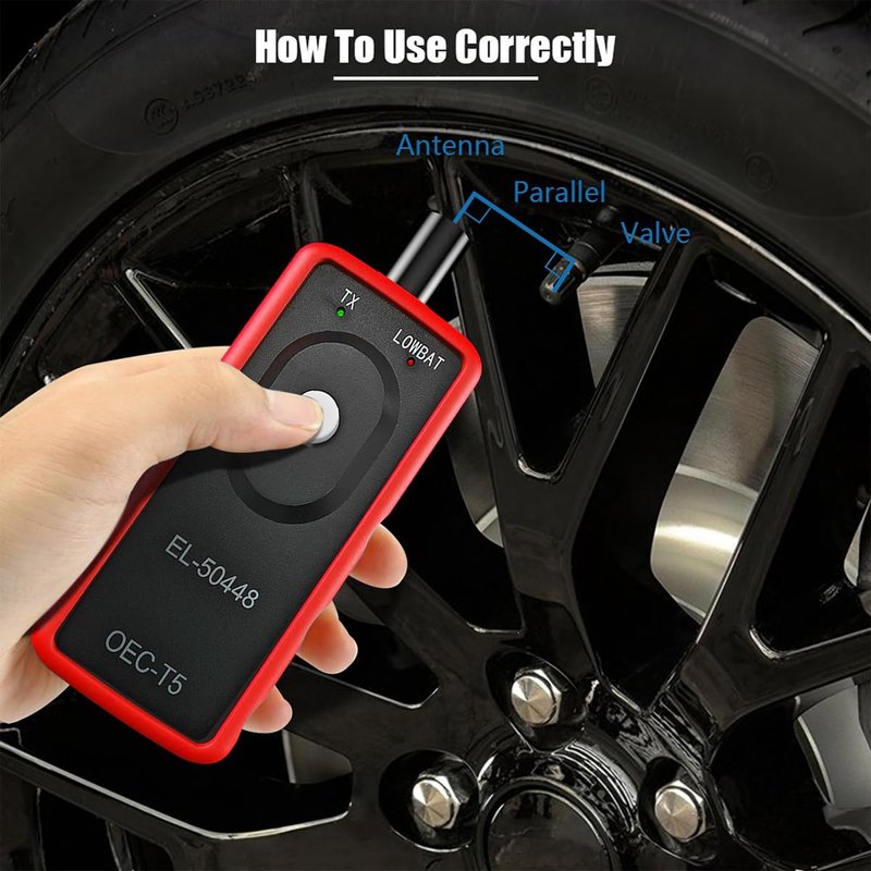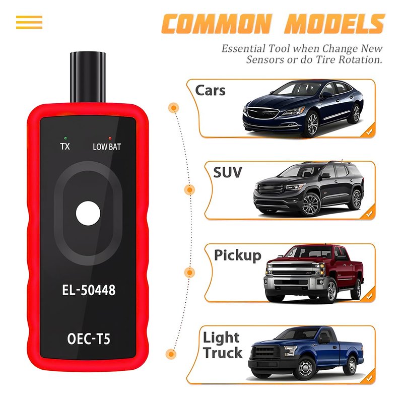 - 【Standard Specifications】: OEC-T5 specifications, EL-50448 measures approximately 6.1 x 2.4 x 1.4 inches and is comfortable to hold. It uses a 9V battery and has an operating temperature of -20~80°C. With it, individuals can easily complete the relearning of the vehicle pressure sensor, which can greatly save time and money on trips to the auto store.