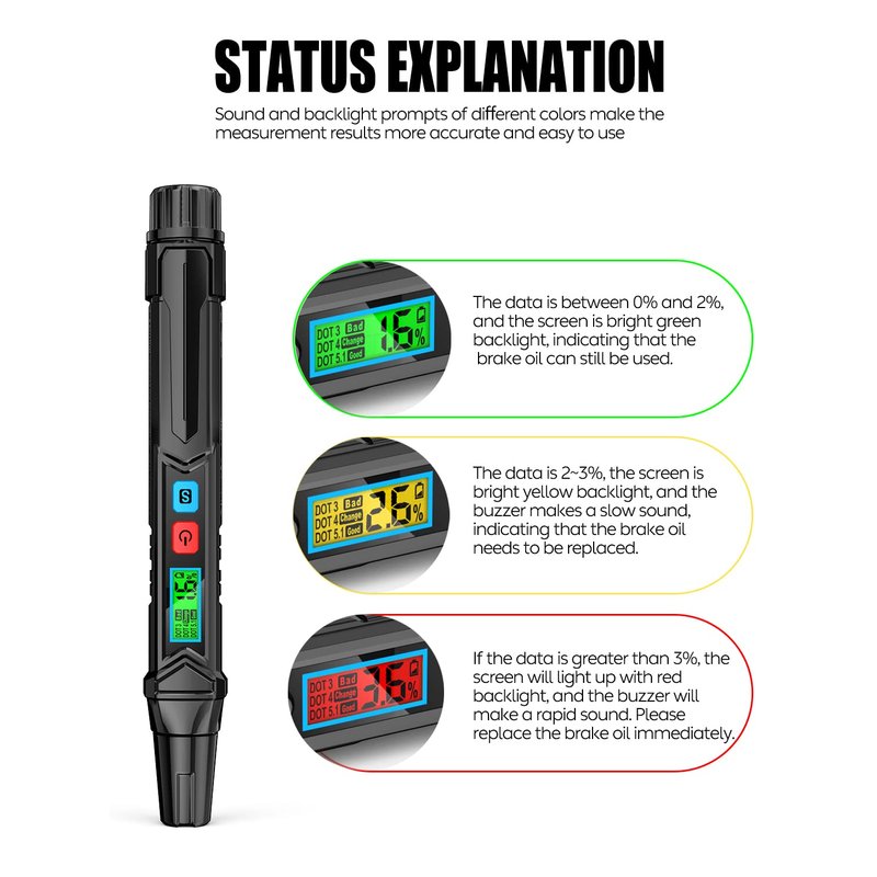 - EASY TO USE: The test procedure is fast and efficient and has a simple control panel. The backlight lights green at 0%-2% data (brake fluid is ready to use). At 2%-3%, the backlight turns yellow and the buzzer sounds slowly (brake fluid needs to be changed). The backlight is red and the buzzer sounds quickly when the data is greater than 3% (brake fluid needs to be changed immediately).