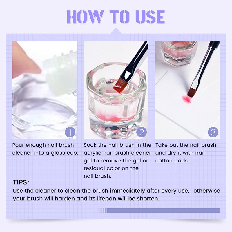 - 【How to Use】Frist,pour the nail brush cleaner gel into the cup, than, put the nail brush into the cup to wash. Finally ,use a paper towel to absorb the water.