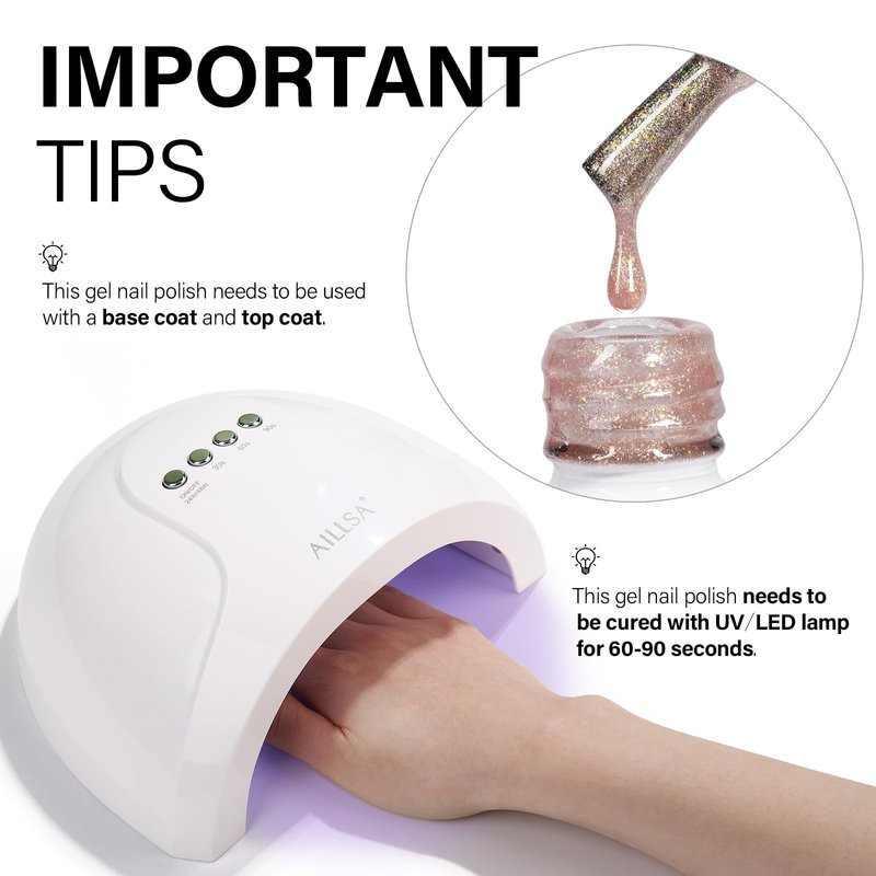 - LONG-LASTING SHINE - AILLSA Shimmer Holographic gel nail polish needs to be cured under L E D/U V lamp, under the correct use steps, it can last for 21-28 days and keep the shiny luster. You'll never have to worry about your nails peeling off while showering and doing housework. Let AILLSA serve you a longer time!