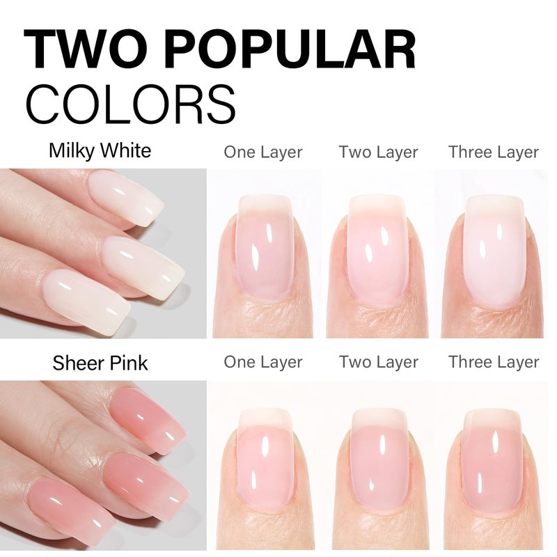 - ALL-MATCH COLORS: The gel nail tips kit includes two colors jelly gel polish: milky white and light pink, matching any outfit or occasion. Two colors can also be paired with each other to create your own nail style. The color depth depends on your nail base color and the number of layers you apply, the fewer layers the more sheer and the more layers the more vibrant. Adding the top coat will give your nails a shiny protective finish and prevent scratches from damaging your beautiful nails