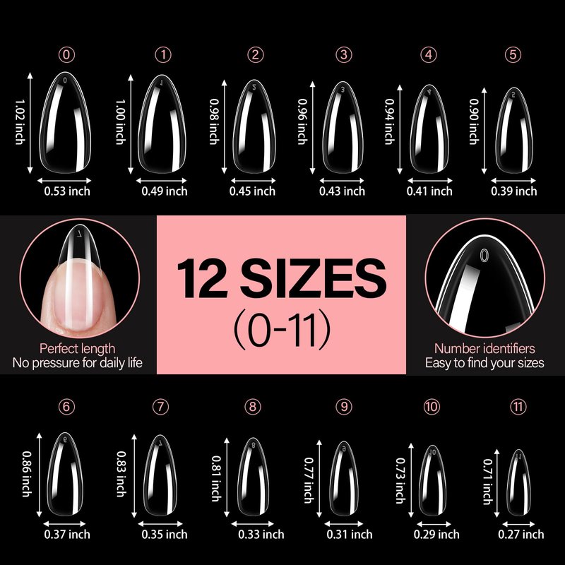 - Multiple Sizes Option: Our almond nail tips include different sizes with each size 18pcs, totally 216pcs, providing you with more options to choose. For the extra sizes, they can be easily trimmed and shaped to suit your preferences, giving you the freedom to express your creativity, avoiding waste. Regarding the dispute about the length of full nail tips, everyone’s nail bed length is different. It is recommended to refer to the size chart when purchasing.