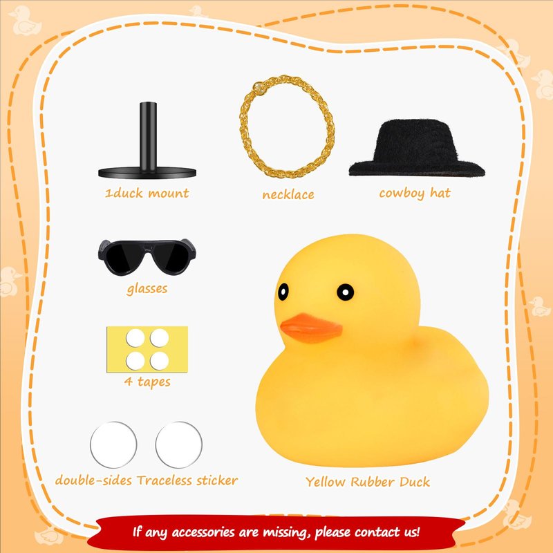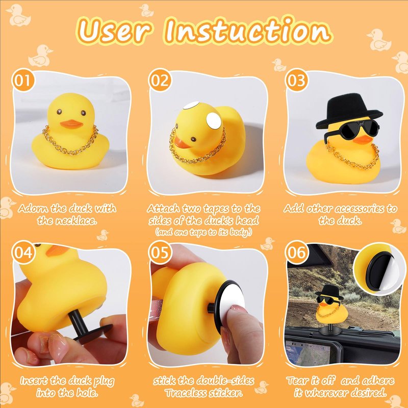 - 【DIY DELIGHT】 - Unleash the joy of do-it-yourself with our car dashboard duck accessories that require assembly. The rubber duck car decoration kit includes all the accessories featured in the picture: a yellow duck, duck plug holder, hat, glasses, necklace, and other accessories, along with 2 double-sided traceless stickers and 4 tapes. Engage in the delightful experience of assembling these components together with your family, creating memorable moments and personalized car decor.