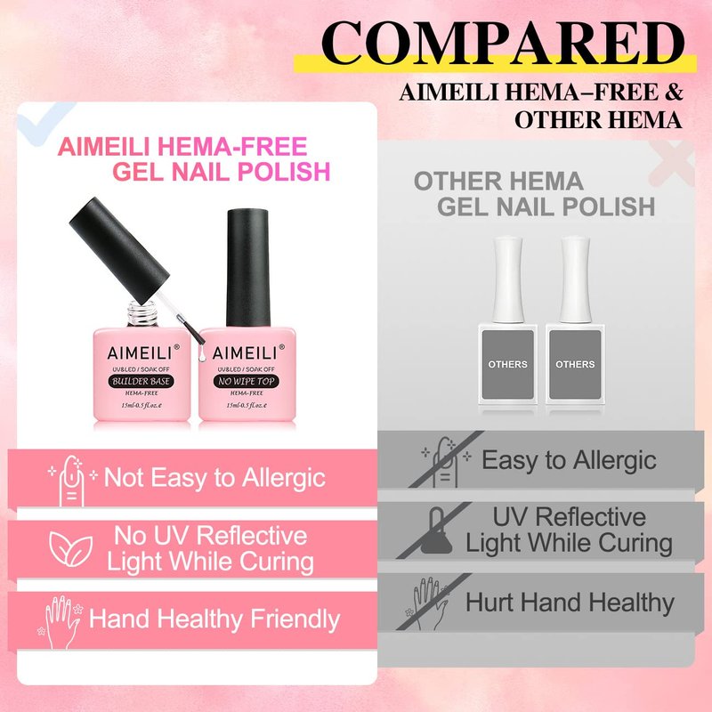 - Easy to Use & Long-Lasting: With improved consistency of gel nail polish, AIMEILI HEMA FREE gel nail polish is smooth and easy to apply. Soak off Gel Nail Polish need to be cured under nail lamp. Average curing time suggested 30-120 secs. With proper application, you could enjoy 28 days manicure.