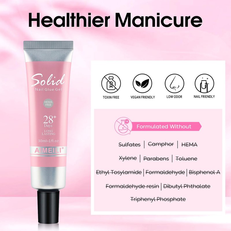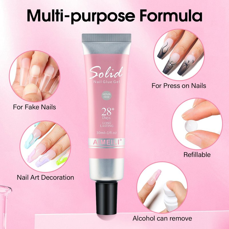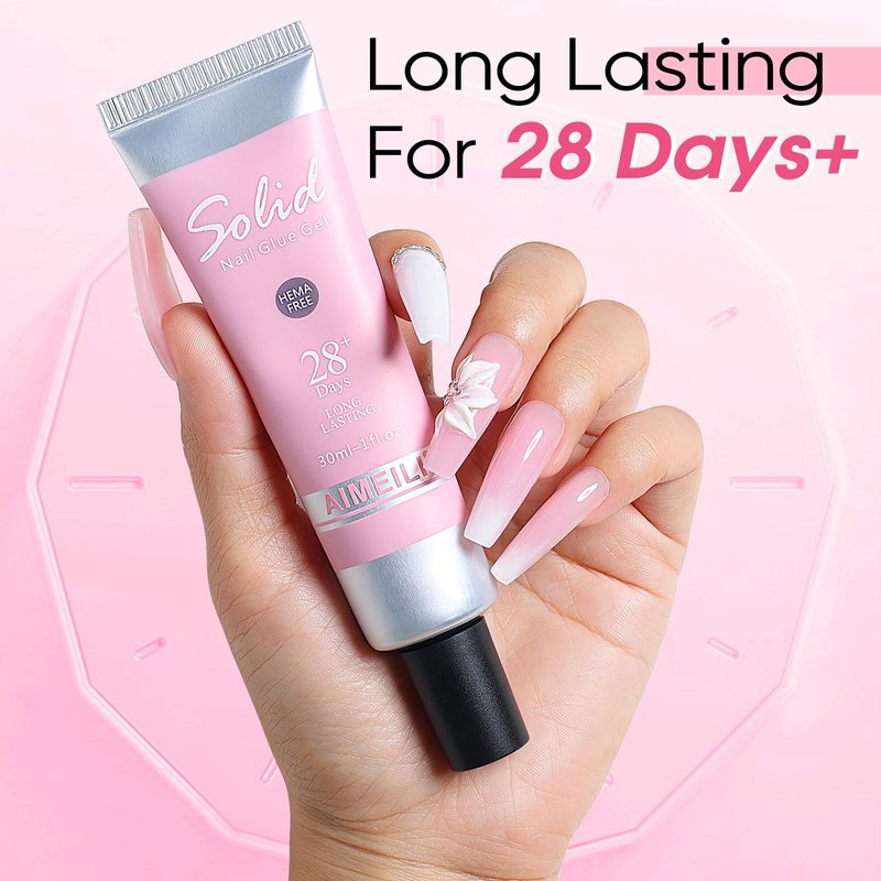 - AIMEILI solid gel nail glue with perfect viscosity and super sticky. It'll be fixed in 5-second curing. Then free your hand and keep curing for 60s to get fully fixed. No pop-up and rebound. Fit for flat and curved nail beds.