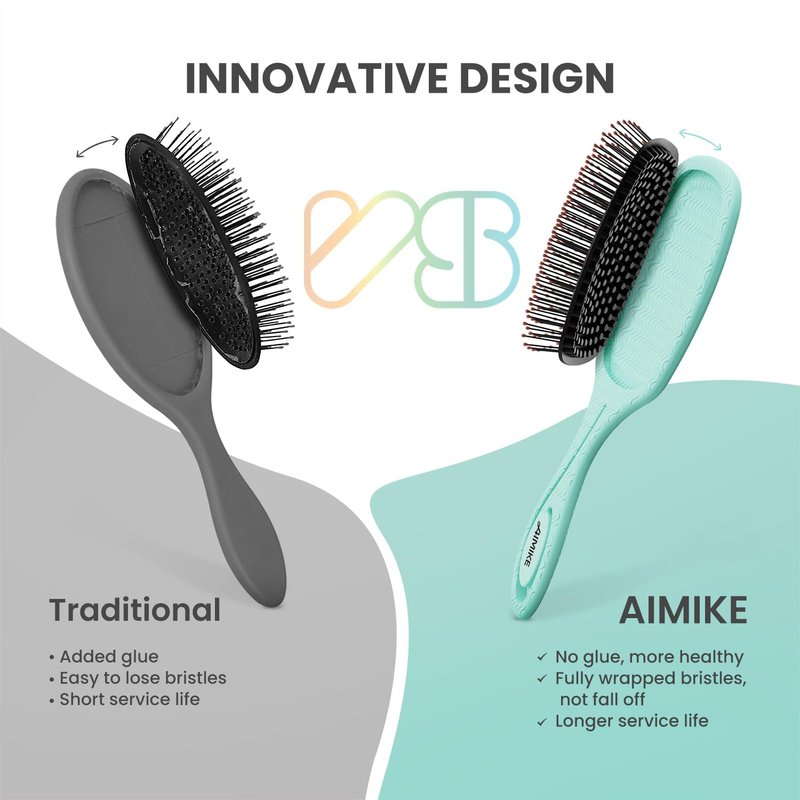 - Upgraded Sophisticated Design: AIMIKE's upgraded paddle hair brush features air cushion with glue-free construction, safe and eco-friendly; Wrapped tightly and securely bristles that won't easily fall off like traditional hairbrushes for longer-lasting use. This detangler brush's compact design and ergonomic handle for a comfortable grip, ideal for styling on your routine and on-the-go