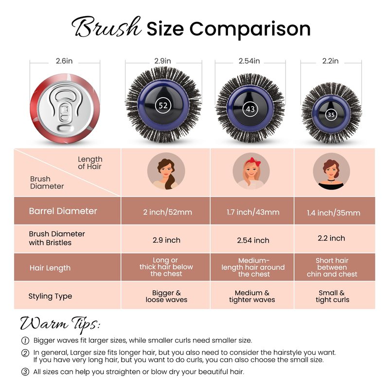 3. The smaller the diameter, the more curl or bend you'll get in your hair. The larger the diameter, the more fullness and "c" shaping your hair will have. Make your life easier and your hair healthier with the Nano Ionic Ceramic Round Brush by Aimike!