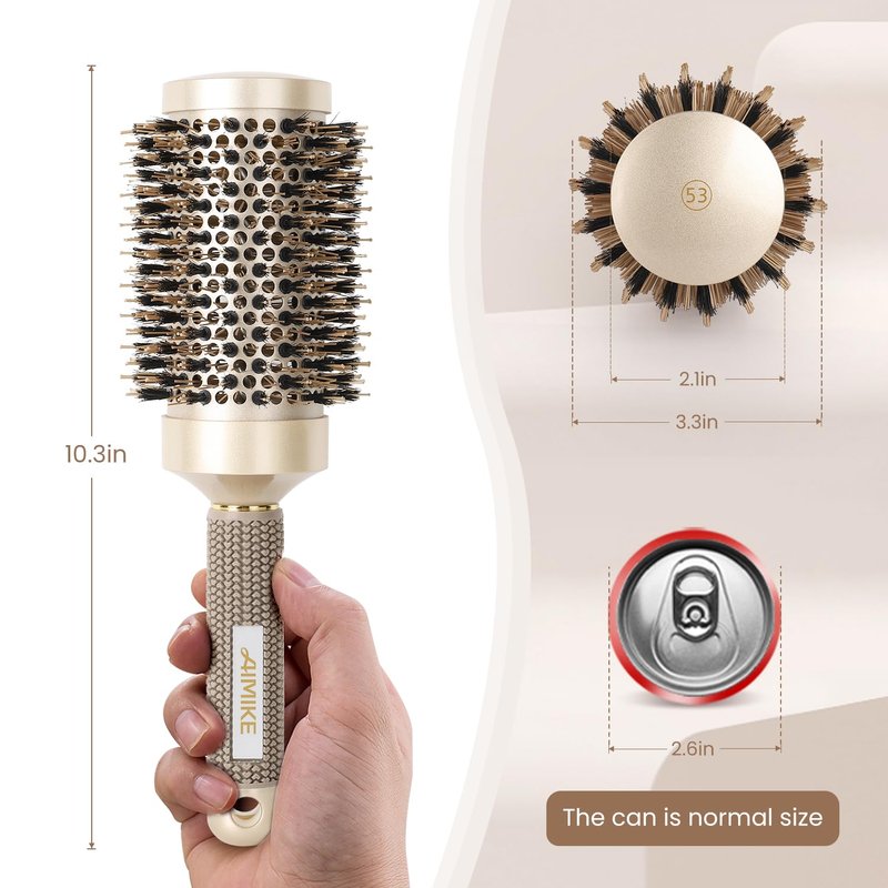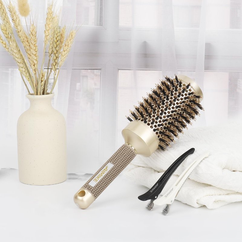 AIMIKE Round Hair Brush, Nano Thermal Ceramic & Ionic Tech, 2.1 Inch Barrel with Boar Bristles for Enhanced Texture, Golden, Hair Drying, Styling, Curling and Shine + 4 Free Clips