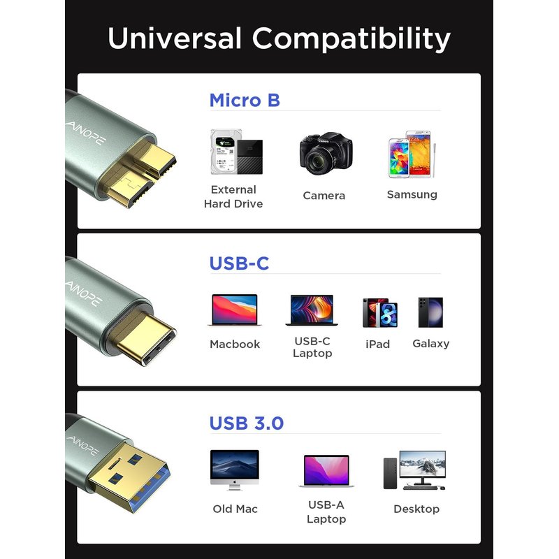 - 【New Upgrade Generation】AINOPE have finished quantities research for product feedbacks. Most of customers refer to the USB 3.0 hard drive cables on the market, including their slow transfer rates, incompatibility with their computer, and plastic construction. Hence, now that these problems have been resolved, you don't need to buy extra cables for each interface. We are offering you an updated micro USB 3.0 hard drive cable with faster transfer rates and a nylon braided design.