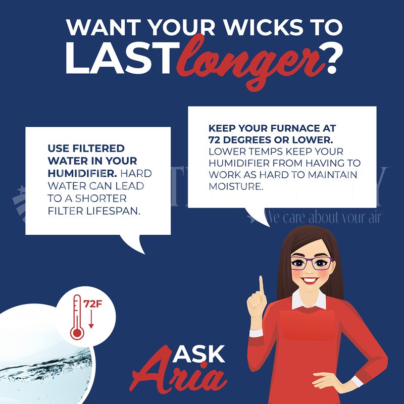 - Application - For Maximum Performance Using Filtered Water Is Best, Hard Water Can Lead To A Shorter Lifespan Of Your Humidifier Filter. Weather Is Also A Factor In The Life Span Of Your Filter. Running Your Furnace Higher Than 72 degrees F Can Make Your Humidifier Work Harder To Get Moisture In The Air Which Can Lead To A Dry Wick. Discoloration Of Humidifier Wick Filters Is Normal And Will Vary Depending On Water Quality. Make Sure Filter Is Flipped Over After Each Tank Fill.