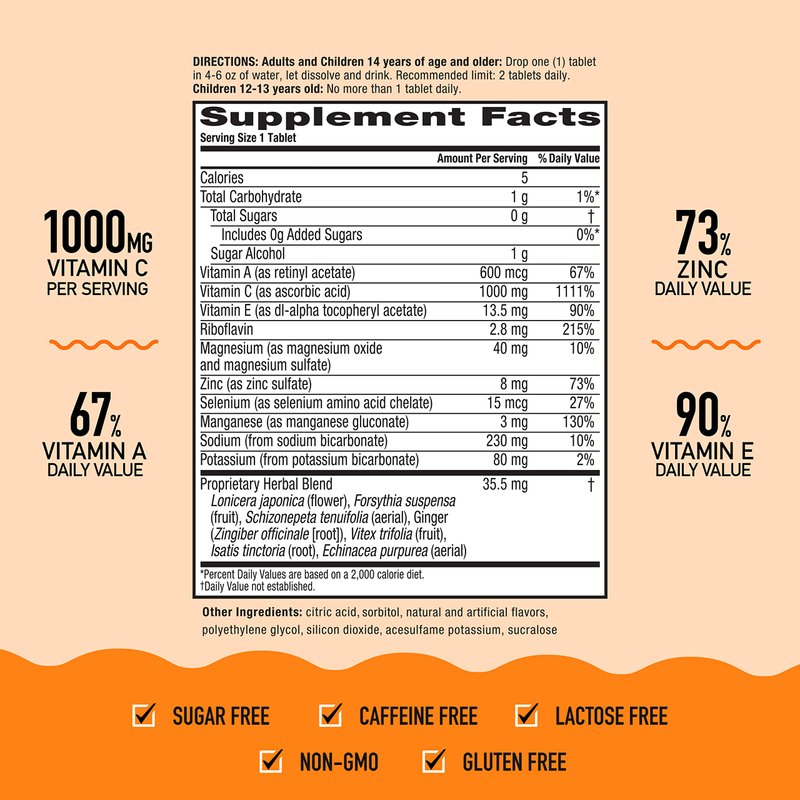 - ZINC SUPPLEMENT: These Vitamin C with Zinc effervescent tablets contain 73% of your daily value of Zinc, which plays a central role in your immune system and is essential for the functioning and signaling of immune cells.*