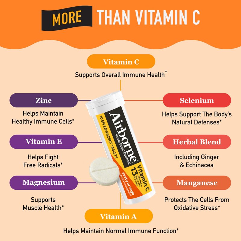 - VITAMIN C 1000mg: Airborne immune support effervescent tablets are packed with 1000mg Vitamin C per serving, which helps support your immune system.