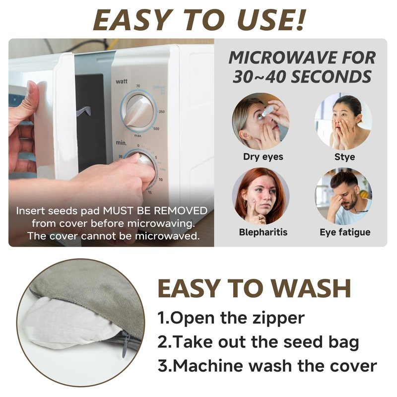 - Esay to Use :The moist, hot compress eye mask is simple, natural, convenient and effective. Simply put the mask in a clean microwave oven for 40 to 90 seconds, then put it on and close your eyes for 8-10 minutes.Even without heating, it can be used as a sleep mask, completely blocking light and allowing you to use it in any scene.