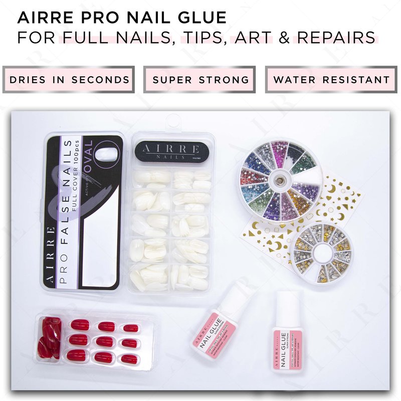 - š āŗ MULTI PURPOSE ā Brush-On Nail Glue for Press-On Full Cover Nails, Artificial Nail Tips, Extensions (Acrylic & Plastic ABS), Gel Nail Stick-Ons and Nail Art (Rhinestones, Gems etc), Fix and Repairs Broken Natural Nails. Kiss your nail problems goodbye and take your nail game to the edge. Impress your friends to NYK and back with your elegant touch on your new nail designs using AIRRE Nail Adhesive. For a look that lasts!