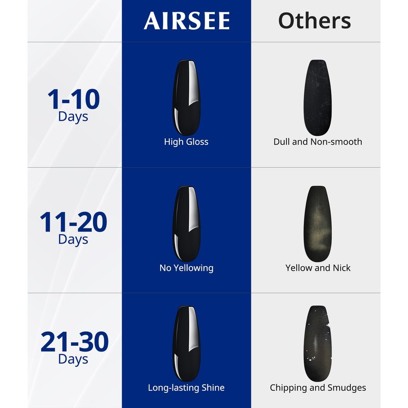 - Easy Application&Smooth: Designed for ease and efficiency,AIRSEE top coat glides on smoothly,providing even coverage in just one stroke. It's the perfect choice for both beginners and seasoned pros looking to achieve salon-quality results at home