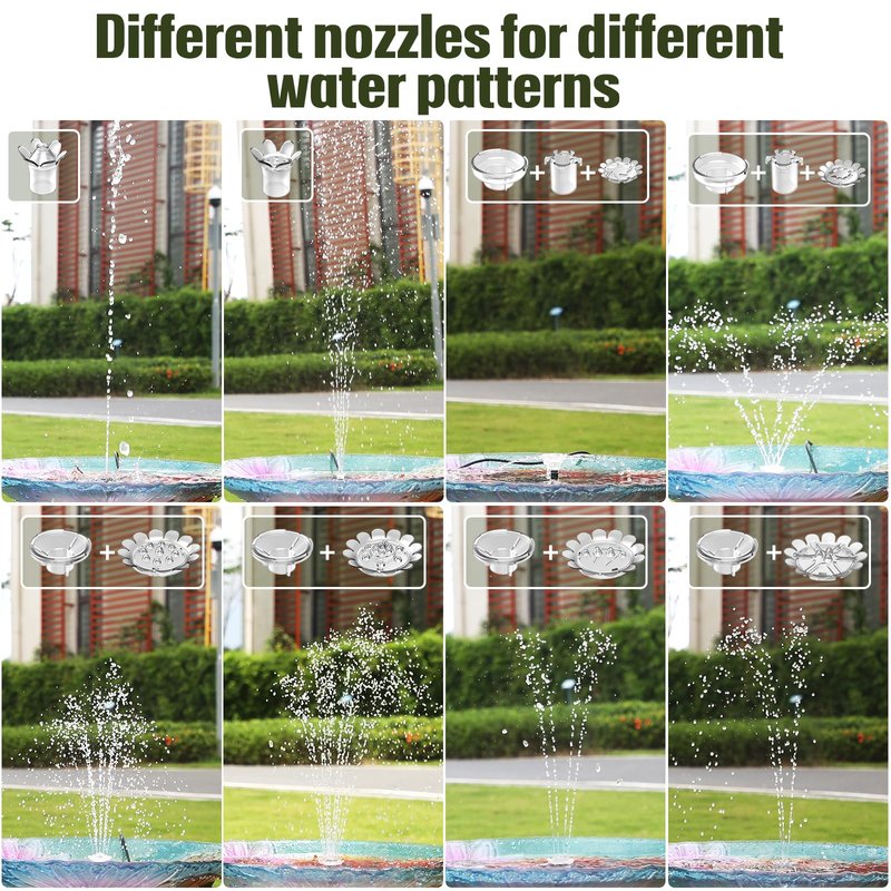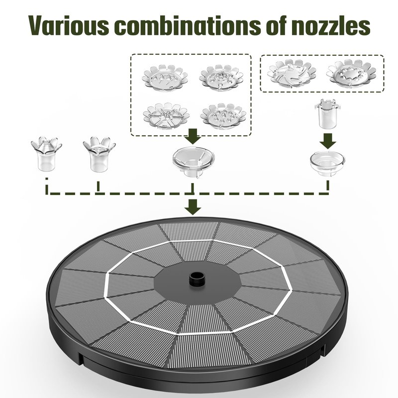 - 【Multiple Nozzles】This floating solar fountain contains two rotating nozzles, four double layered nozzles and four vertical nozzles. You can use different nozzles according to different scenarios.So you can easily enjoy many interesting water features and the cute animals that are attracted to them.